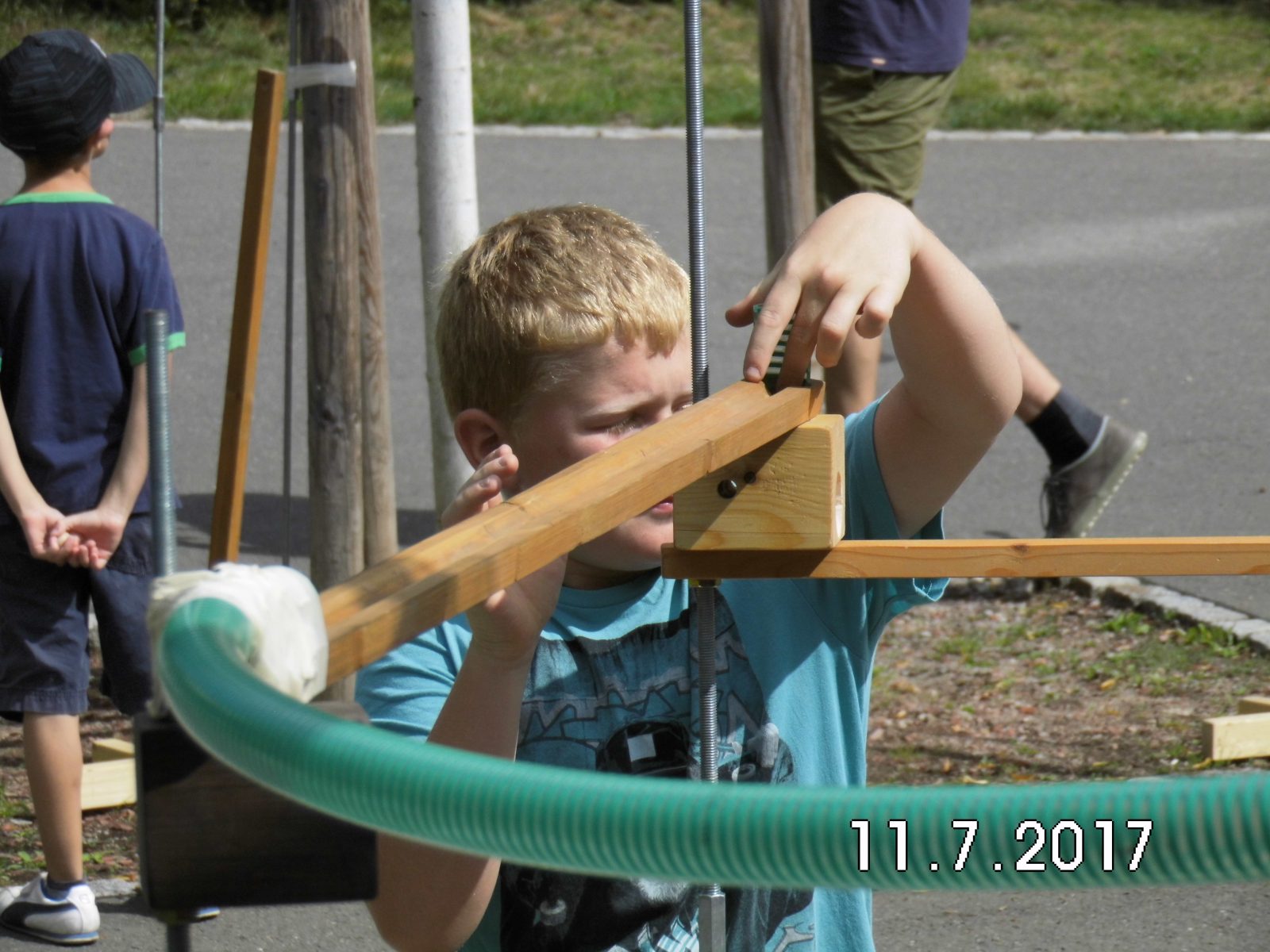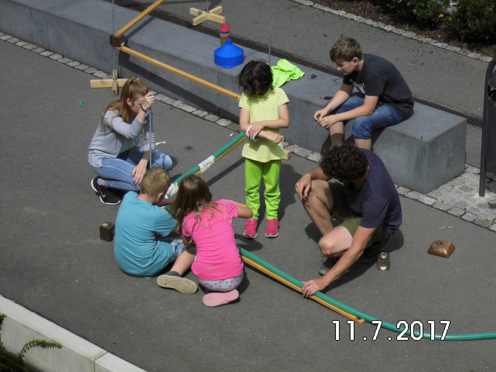 Mit verschiedenen Holzschienen, Schläuchen und Holzständern wird von den Kindern